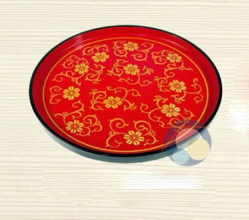 圓/繡花紅黑框 木烤漆托盤 093M71