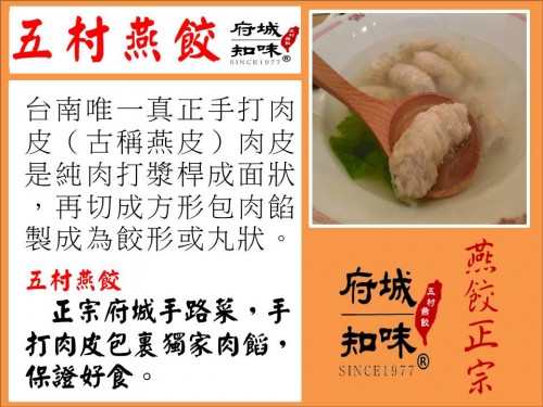 | 五村燕餃 | 傳承百年,功夫名菜。手打肉皮至今無法機械製作,再包裹獨家肉餡,做成湯品,麵食或為火鍋加料最新鮮的美好知味 | 芹定府城 鮮肉丸 |