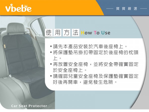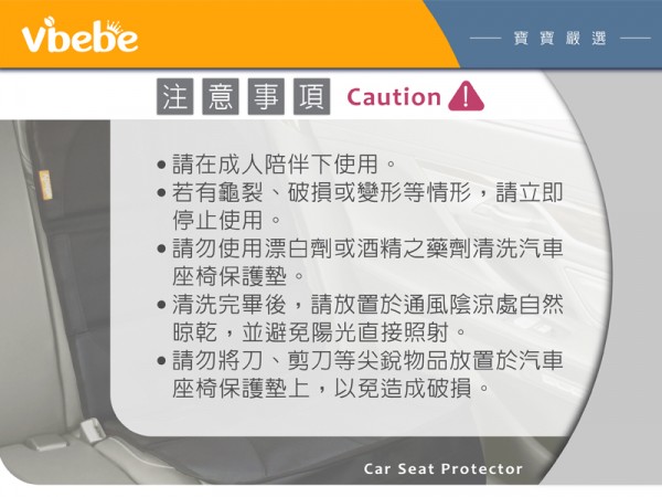 ※ 請勿使用漂白劑或酒精之藥劑清洗汽車座椅保護墊。