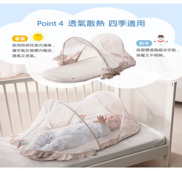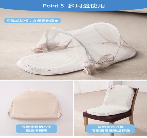 可置於床上或地板上使用。蚊帳拆解後,可單獨當睡墊或椅墊使用。