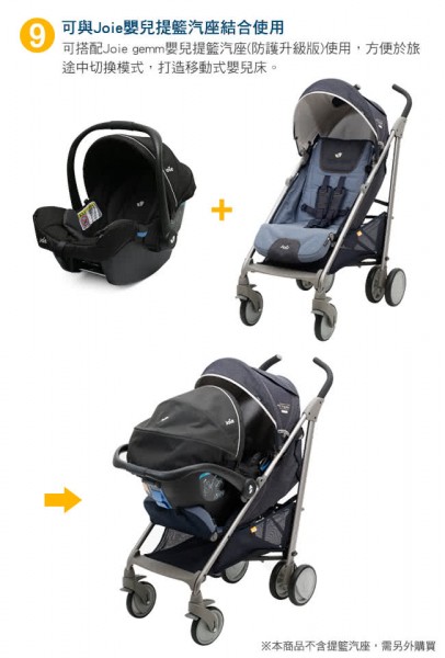8.可轉換為二合一推車,可搭配Joie嬰兒提籃汽座使用