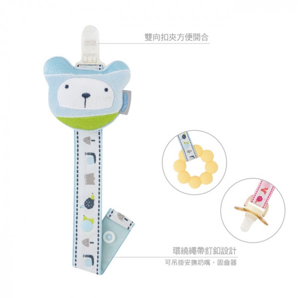 安撫奶嘴、固齒玩具兩用夾,使用好彈性。雙向扣夾方便開合,吊掛空間不設限。