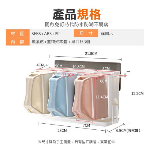 材質:SEBS+ABS+PP 尺寸:詳圖示 內容:無痕貼+置物架本體+漱口杯3個