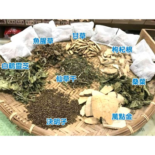 內容物:萬點金、鹹豐草、白鶴靈芝草、桑葉、枸杞枝、魚腥草、仙草幹、橄欖根、薄荷、甜菊、甜珠、決明子、甘草、番瀉葉