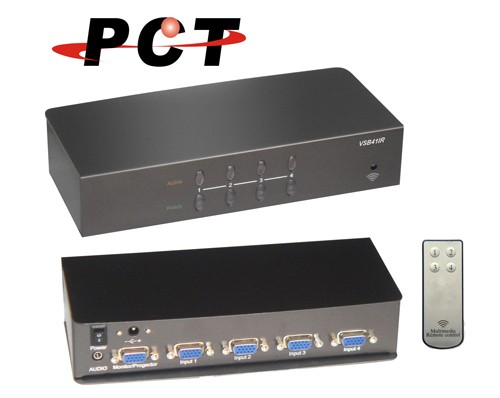 VSB41-IR 是一款 4 進 1 出的 VGA 影音切換器,解析度高達 1920x1440,並支援Audio輸出。使用者可輕鬆將4組不同的電腦系統/筆記型電腦等訊號來源顯示於一台顯示器或是投影機。視訊切換可以減少每台電腦添購顯示器的成本,進而節省機房空間與機房的使用。
