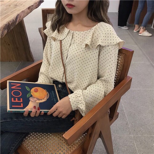 韓版學院風,適合春季,點點復古長袖雪紡荷葉領襯衫,小清新淑女甜美氣質。