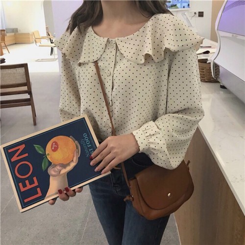 韓版學院風春季點點復古長袖雪紡荷葉領襯衫